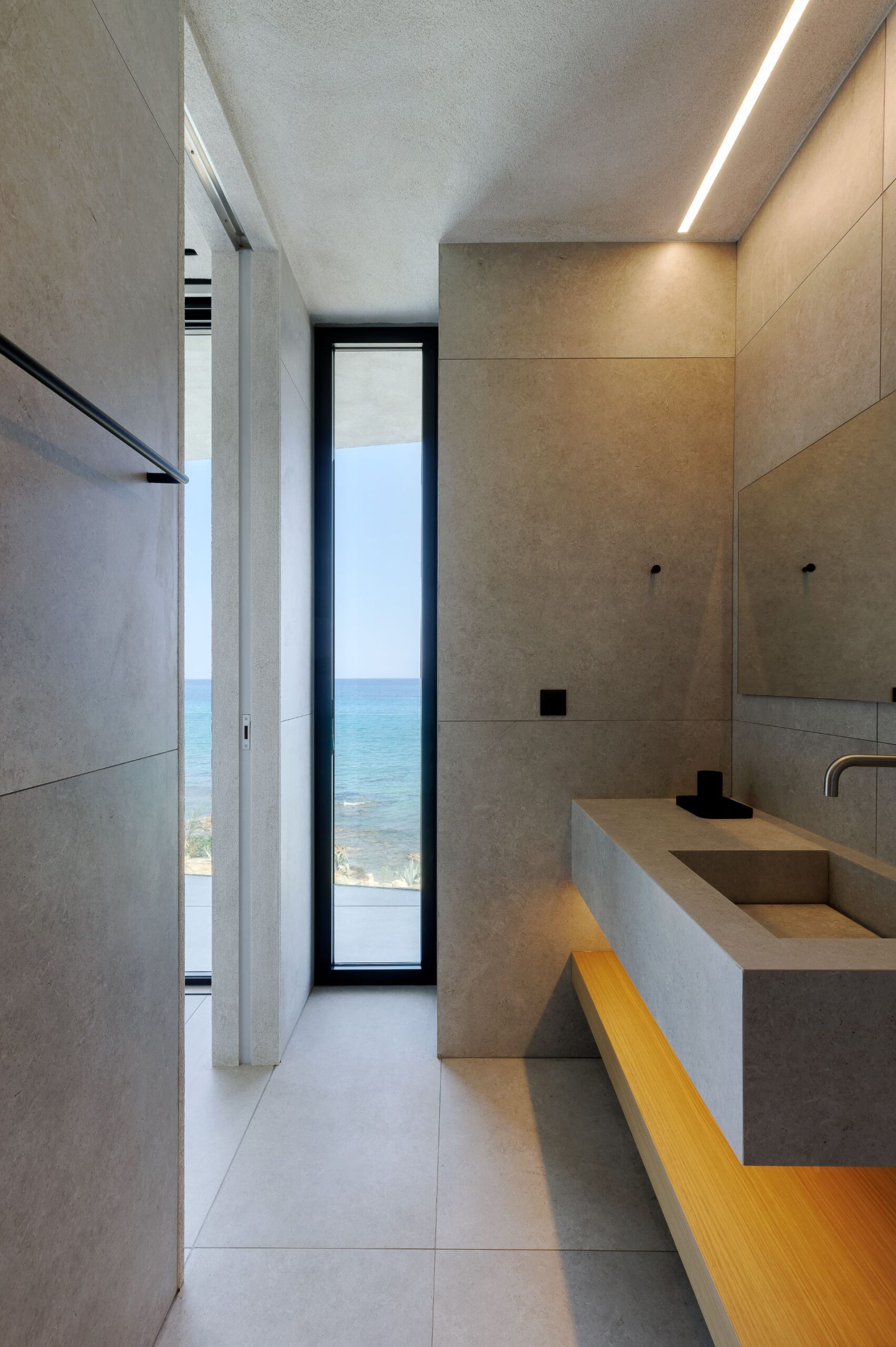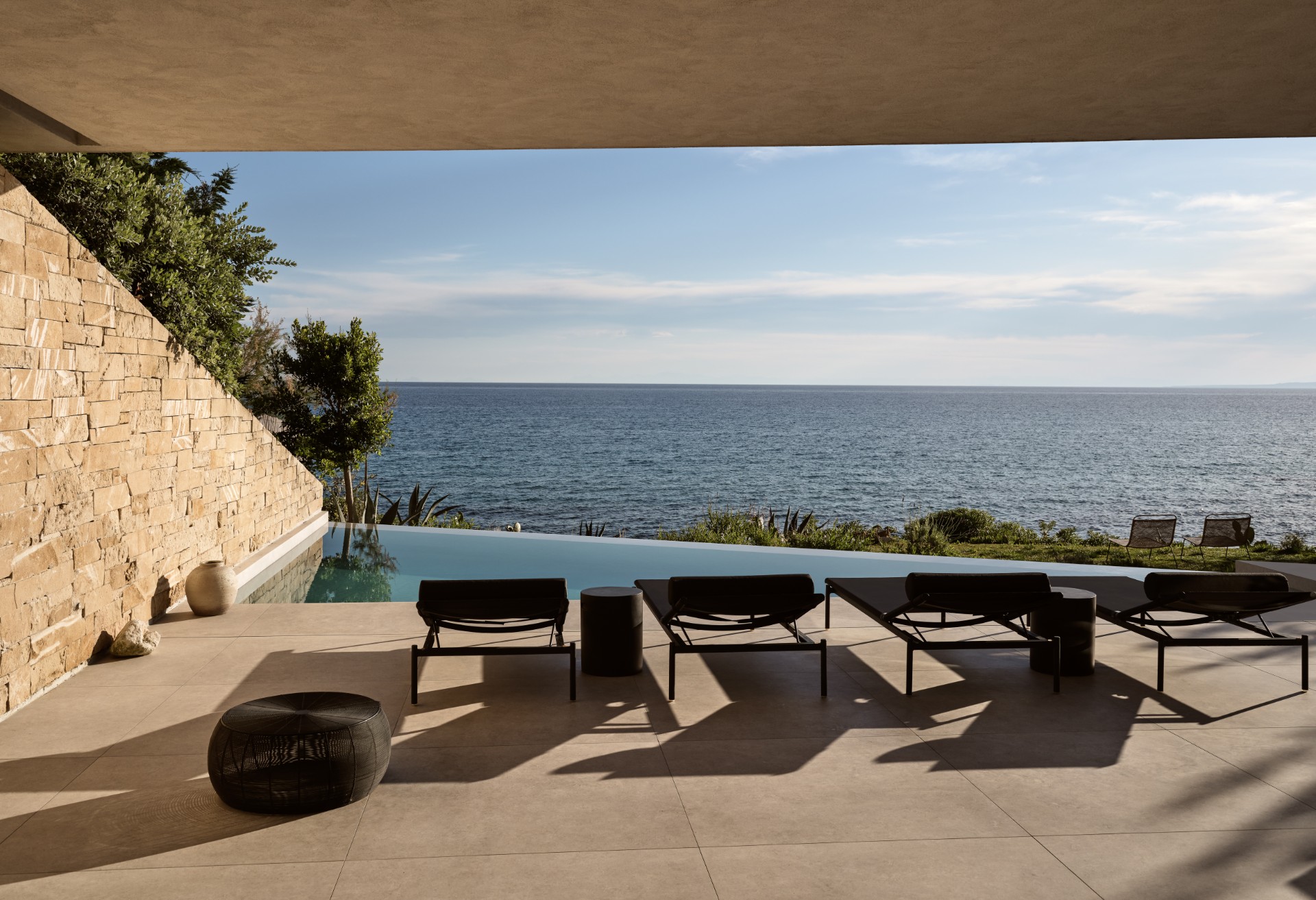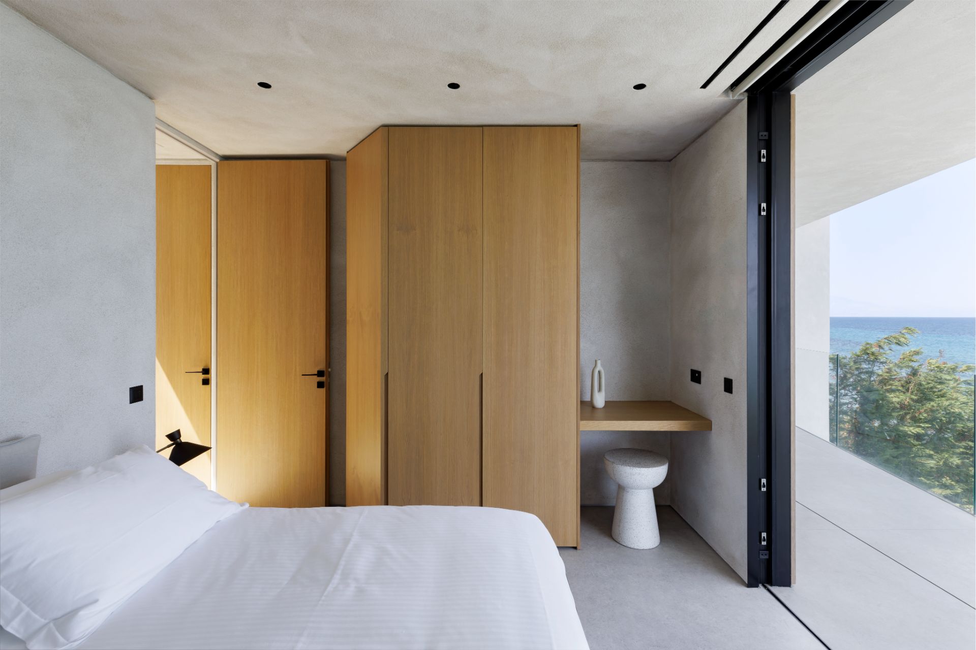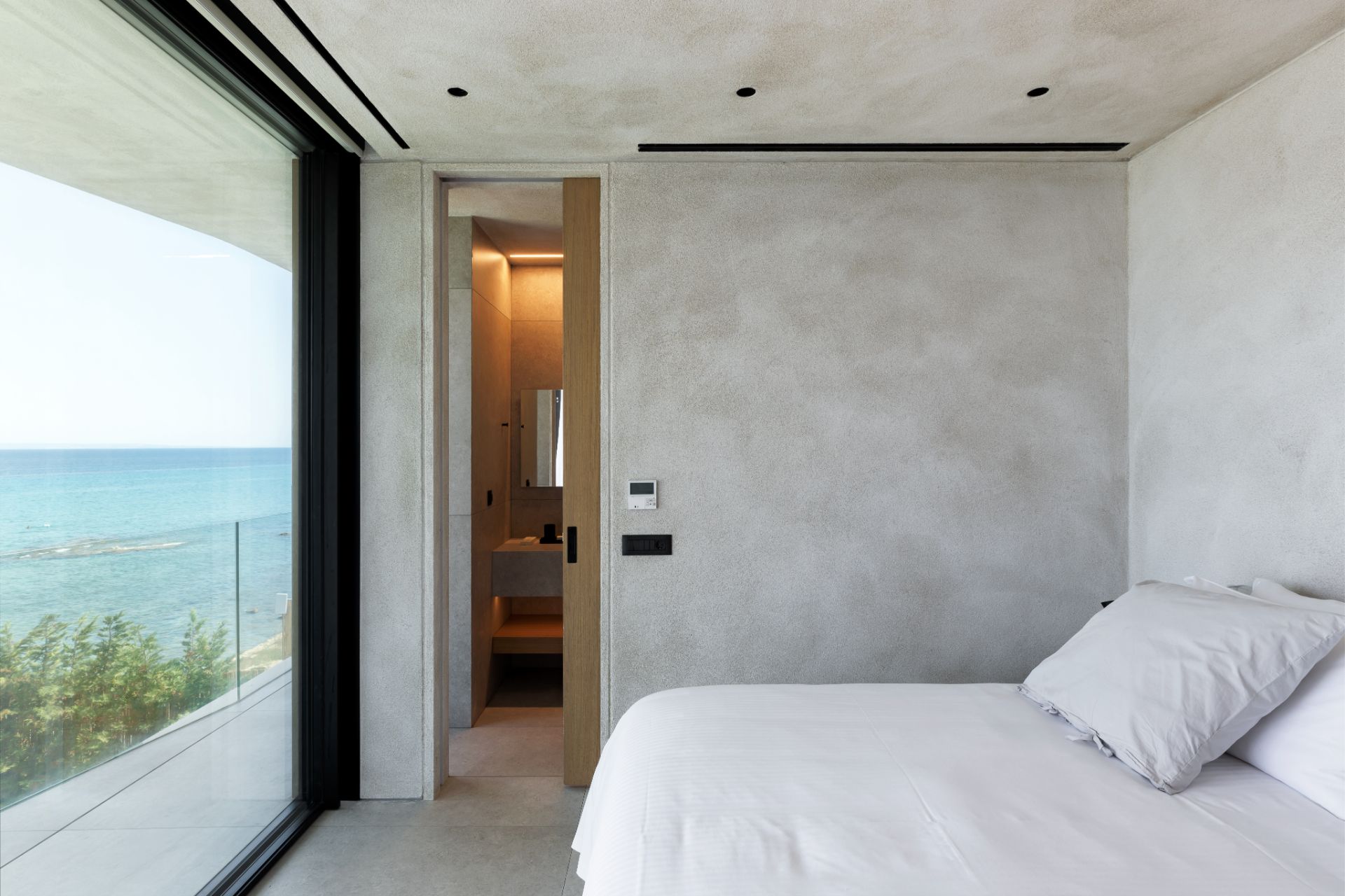 The upper level of the villa showcases the well-appointed bedrooms. Balancing comfort and unique design, three of the bedrooms open up to a private balcony that overlooks the captivating sea, enhancing the serene ambiance of the space. The fourth bedroom does not feature a balcony or sea view. Each one is accompanied by its own private en-suite bathroom.