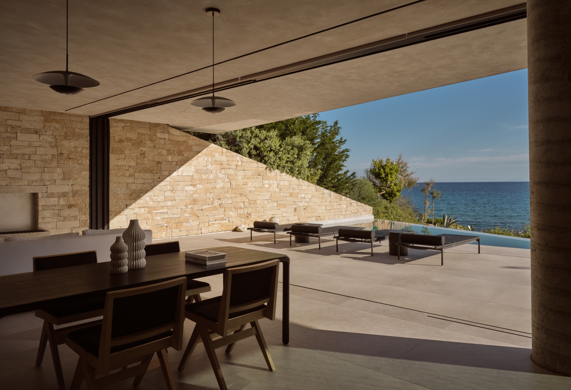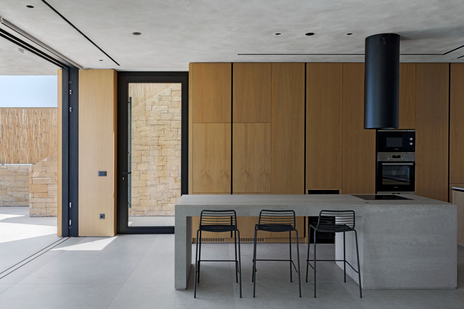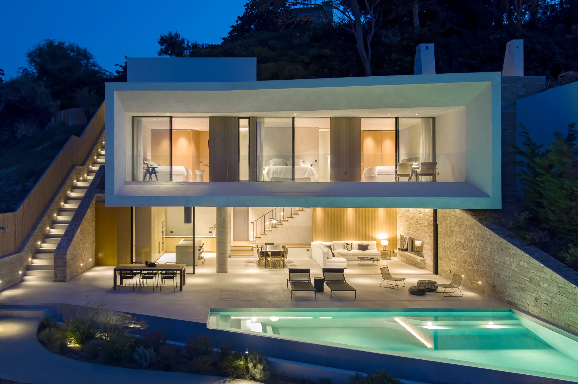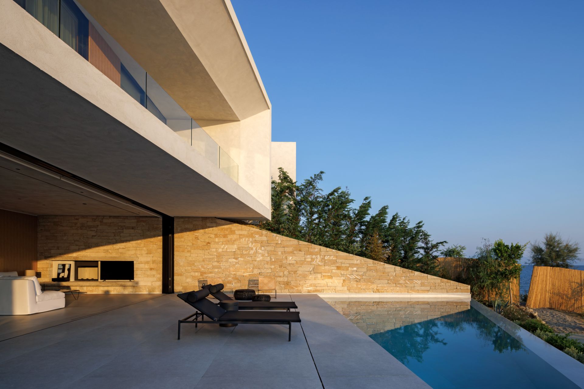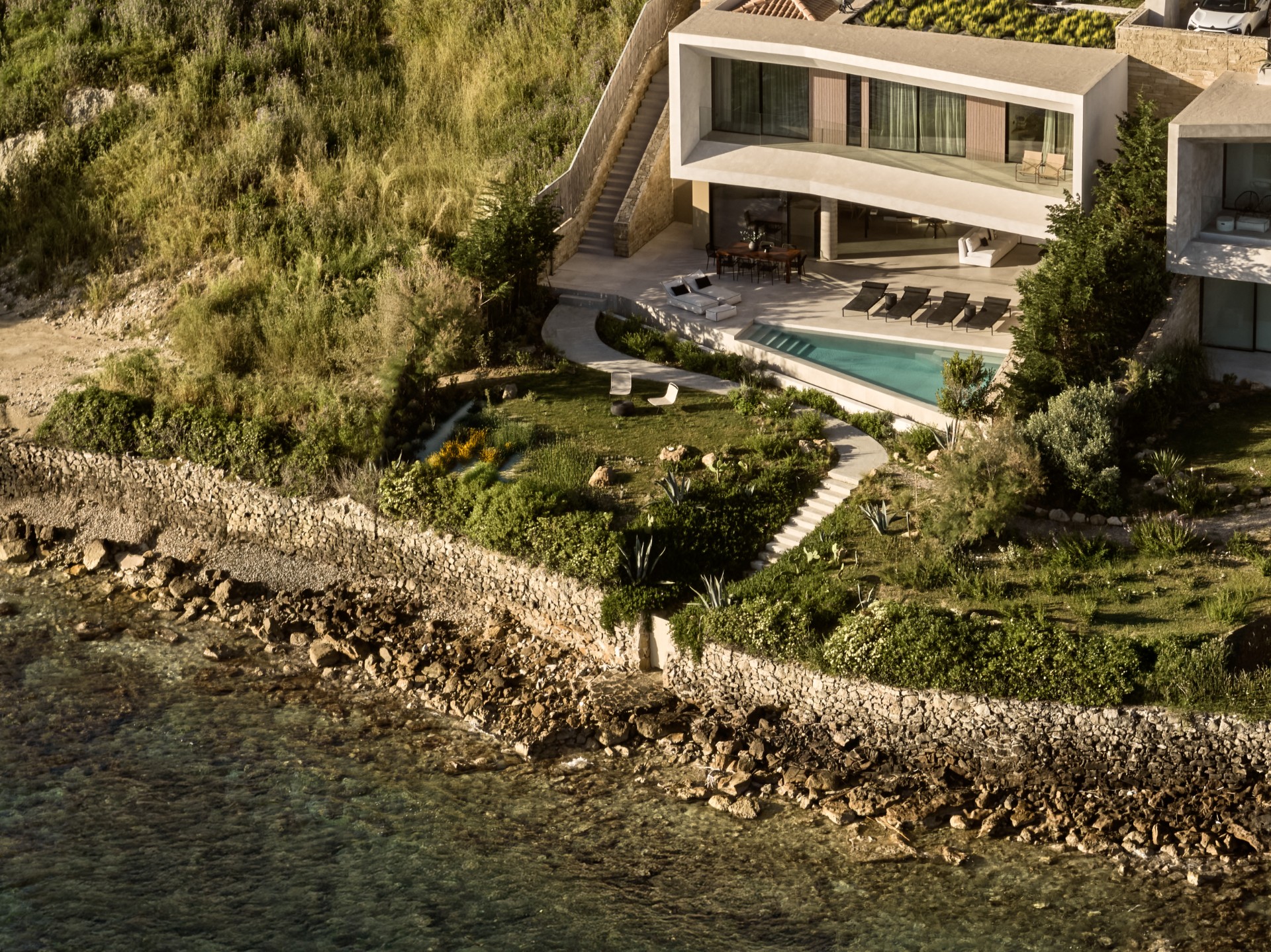 The upper level of the villa showcases the well-appointed bedrooms. Balancing comfort and unique design, three of the bedrooms open up to a private balcony that overlooks the captivating sea, enhancing the serene ambiance of the space. The fourth bedroom does not feature a balcony or sea view. Each one is accompanied by its own private en-suite bathroom.
